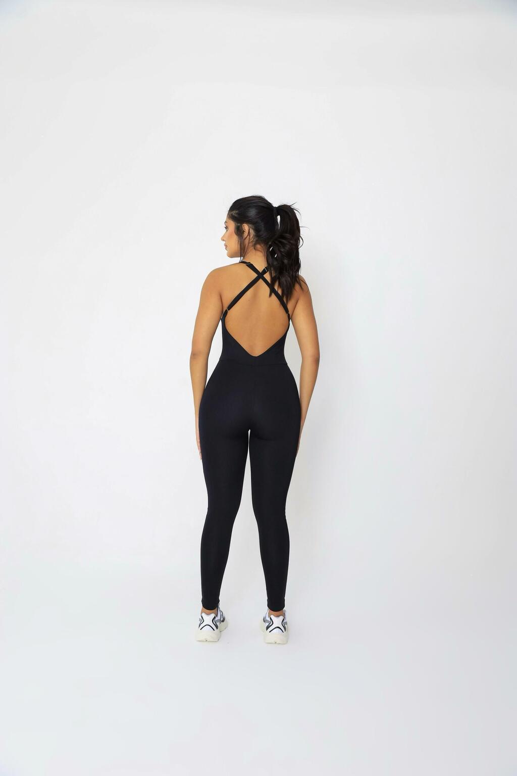 Macacão longo com frente dupla, alças finas com regulagem e costas abertas.